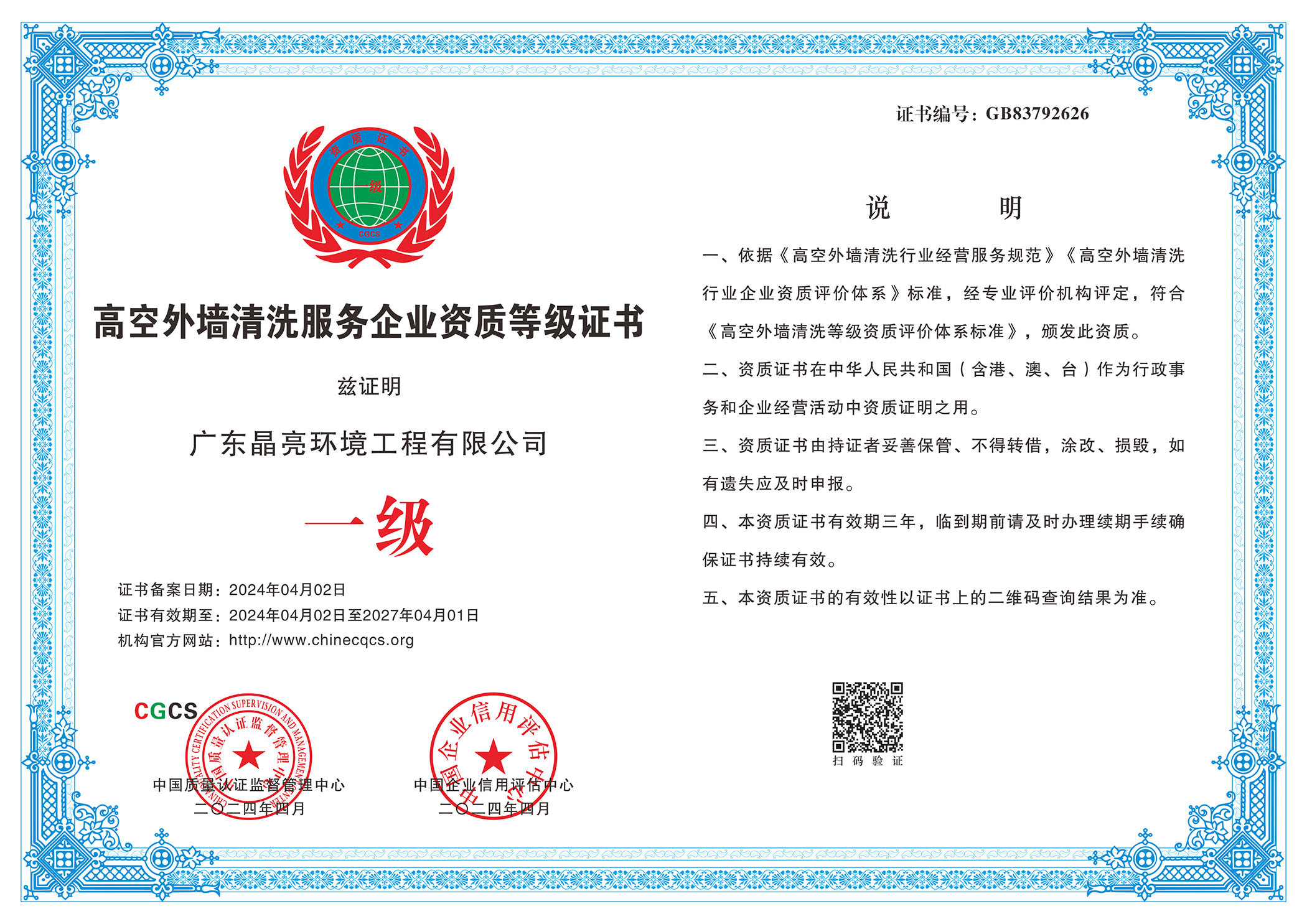 高空外墻清洗服務(wù)企業(yè)資質(zhì)等級證書